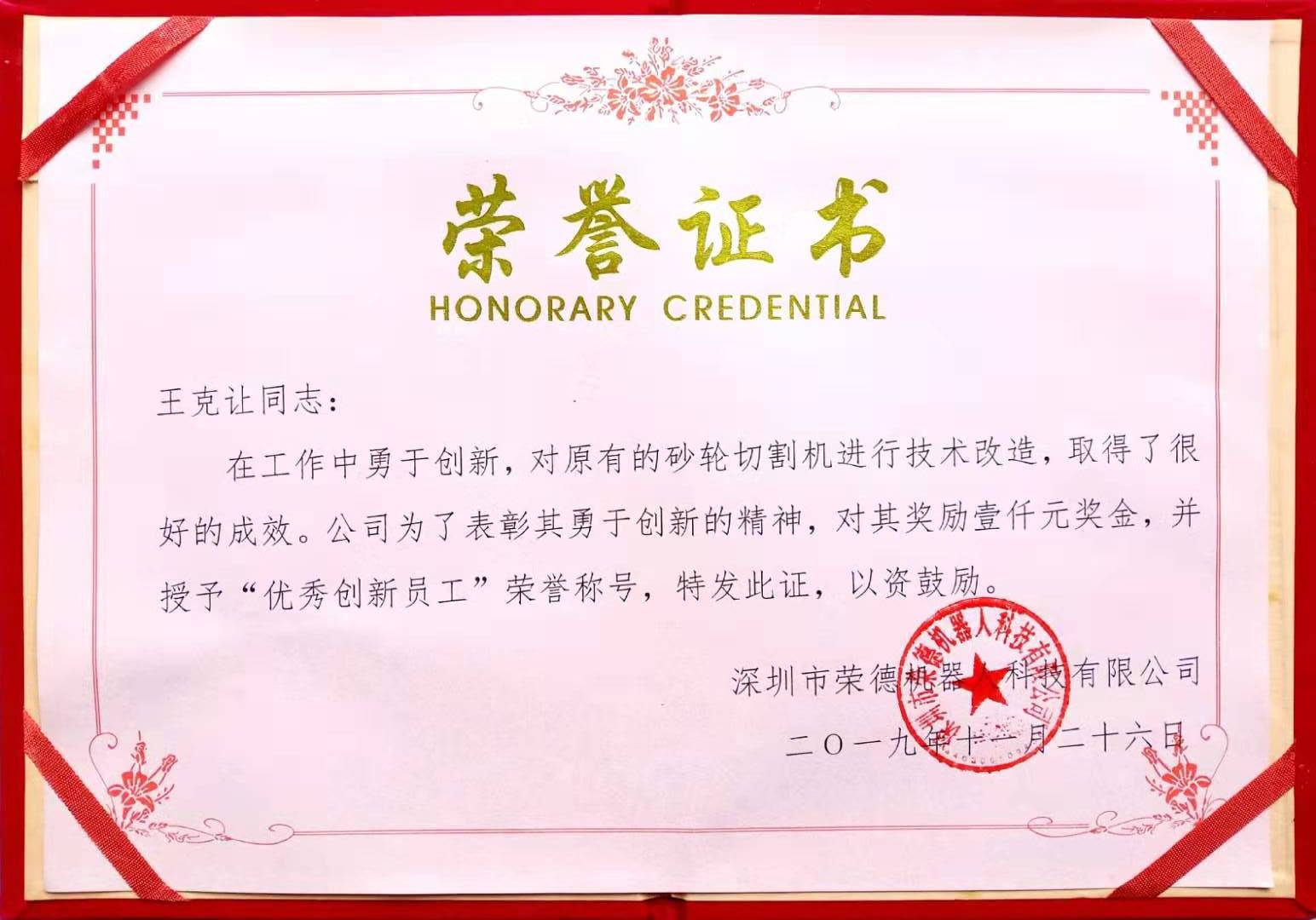 2019年,王克讓對原有的砂輪切割機進行技術(shù)改造,取得了很好的成效,公司對此創(chuàng)新精神給予1000元的獎勵