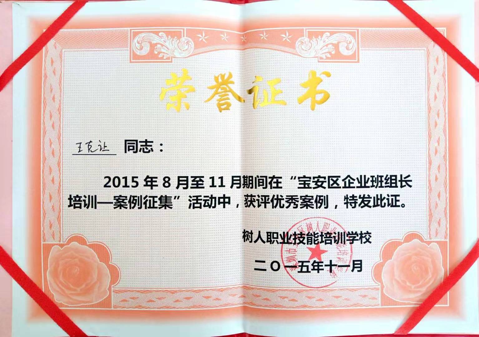 2015年,王克讓在寶安區(qū)組織的企業(yè)培訓(xùn)活動中獲得優(yōu)秀獎。