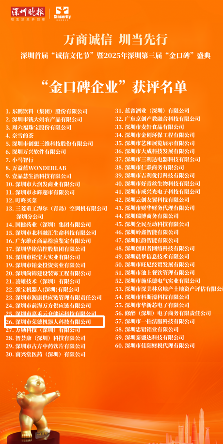 近日,備受矚目的第三屆 “金口碑” 年度評選盛典在深圳圓滿落幕。深圳市榮德機器人科技有限公司憑借二十余年深耕噴涂自動化領域的專業(yè)積淀、誠信經營的企業(yè)底色與卓越的市場口碑,從近 18000 家參評企業(yè)中脫穎而出,成功獲評 “金口碑企業(yè)” 榮譽稱號。這一殊榮不僅是行業(yè)與社會對榮德機器人綜合實力的高度認可,更是對其 “誠信為本、品質為魂” 經營理念的有力印證。